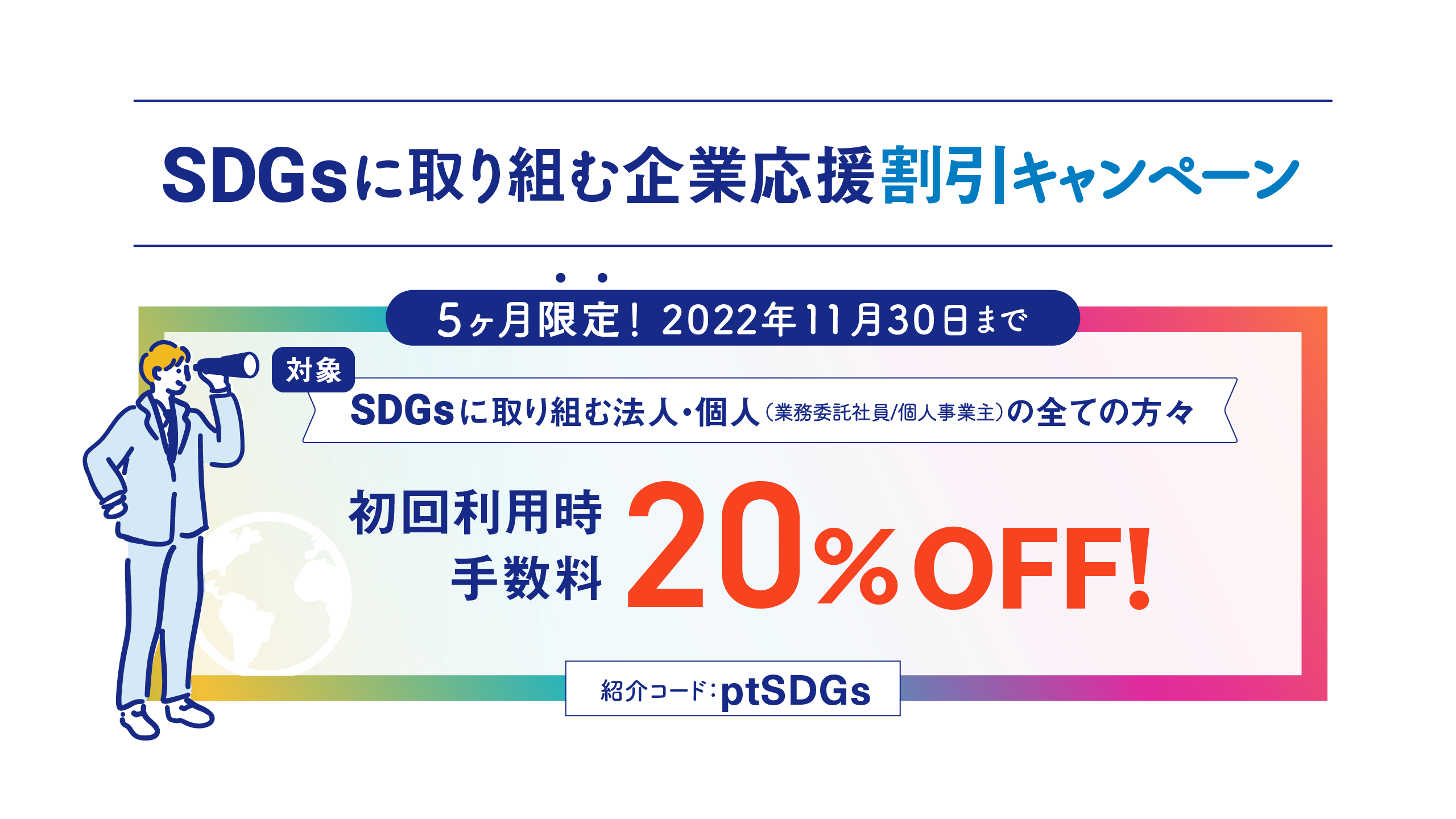 ・ご利用方法:https://paytoday.jp/ へアクセス▶新規登録時、紹介コード“ptSDGs”を紹介コード入力欄にご入力ください