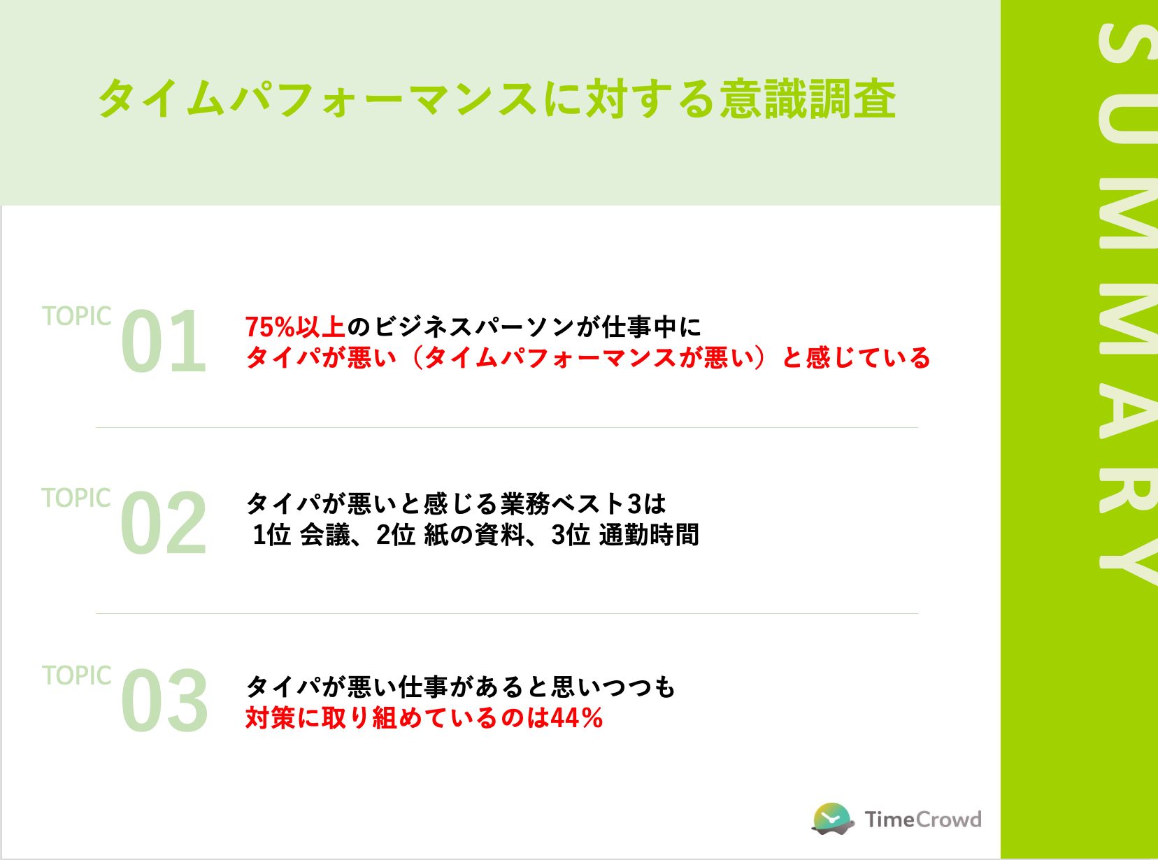 ビジネスパーソンの約8割がタイパの悪い仕事を経験しているにも関わらず、実際に対策を講じることができている人は45%ほどである ということが分かりました。