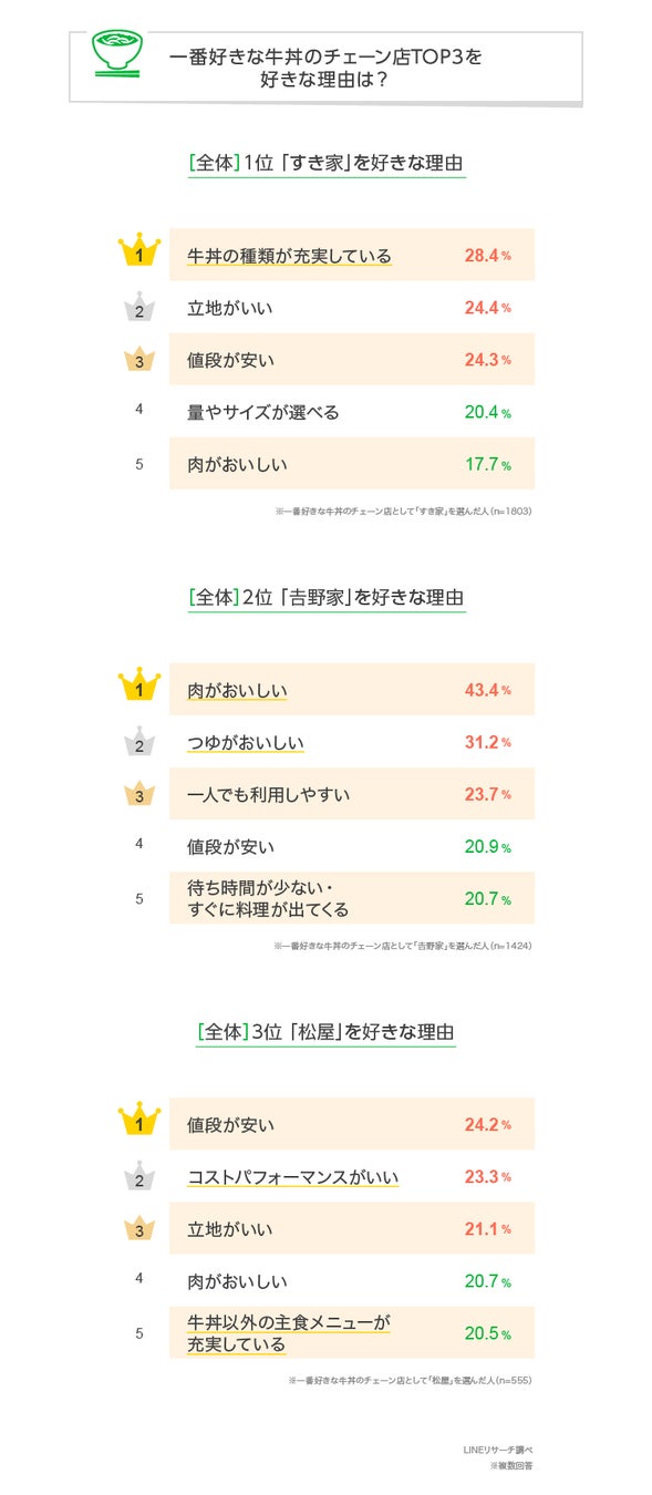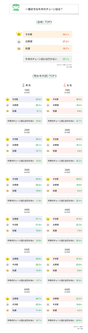 このたびLINEリサーチでは、日本全国の男女を対象に、一番好きな牛丼のチェーン店やそのチェーン店を好きな理由について調査しましたので、その結果をお知らせいたします。