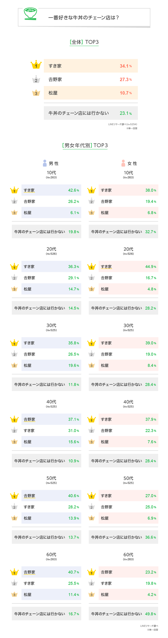 このたびLINEリサーチでは、日本全国の男女を対象に、一番好きな牛丼のチェーン店やそのチェーン店を好きな理由について調査しましたので、その結果をお知らせいたします。