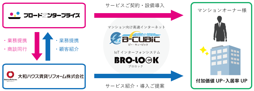 大和ハウス賃貸リフォームが主たる事業とする賃貸住宅リフォーム事業にて、ブロードエンタープライズのマンション向け高速インターネット「B-CUBIC」及びIoTインターフォンシステム「BRO-LOCK」を、賃貸物件の所有者に導入提案を行います。なお、具体的な実施内容につきましては、今後、物件ごとにカスタマイズされた提案内容を、それぞれ個別に締結する契約書において詳細を定める予定です。