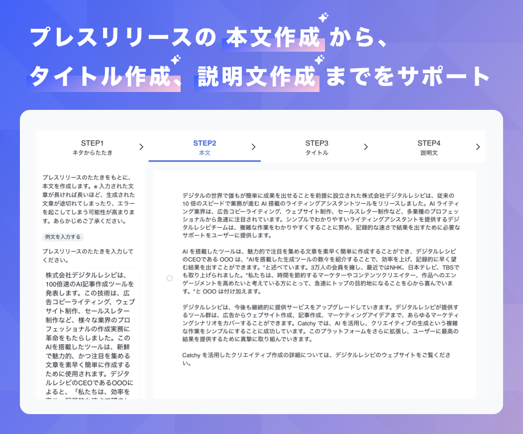 「ワンクリックイノベーション」を目指すテクノロジースタートアップ 株式会社デジタルレシピ(本社:東京都渋谷区、代表取締役:伊藤新之介)は、AI ライティングアシスタント「Catchy(キャッチー)」にて、新たに「プレスリリース作成ワークフロー」機能の提供を開始しました。本機能は、プレスリリースの作成をサポートするための効果的でシンプルなワークフローを提供するものです。