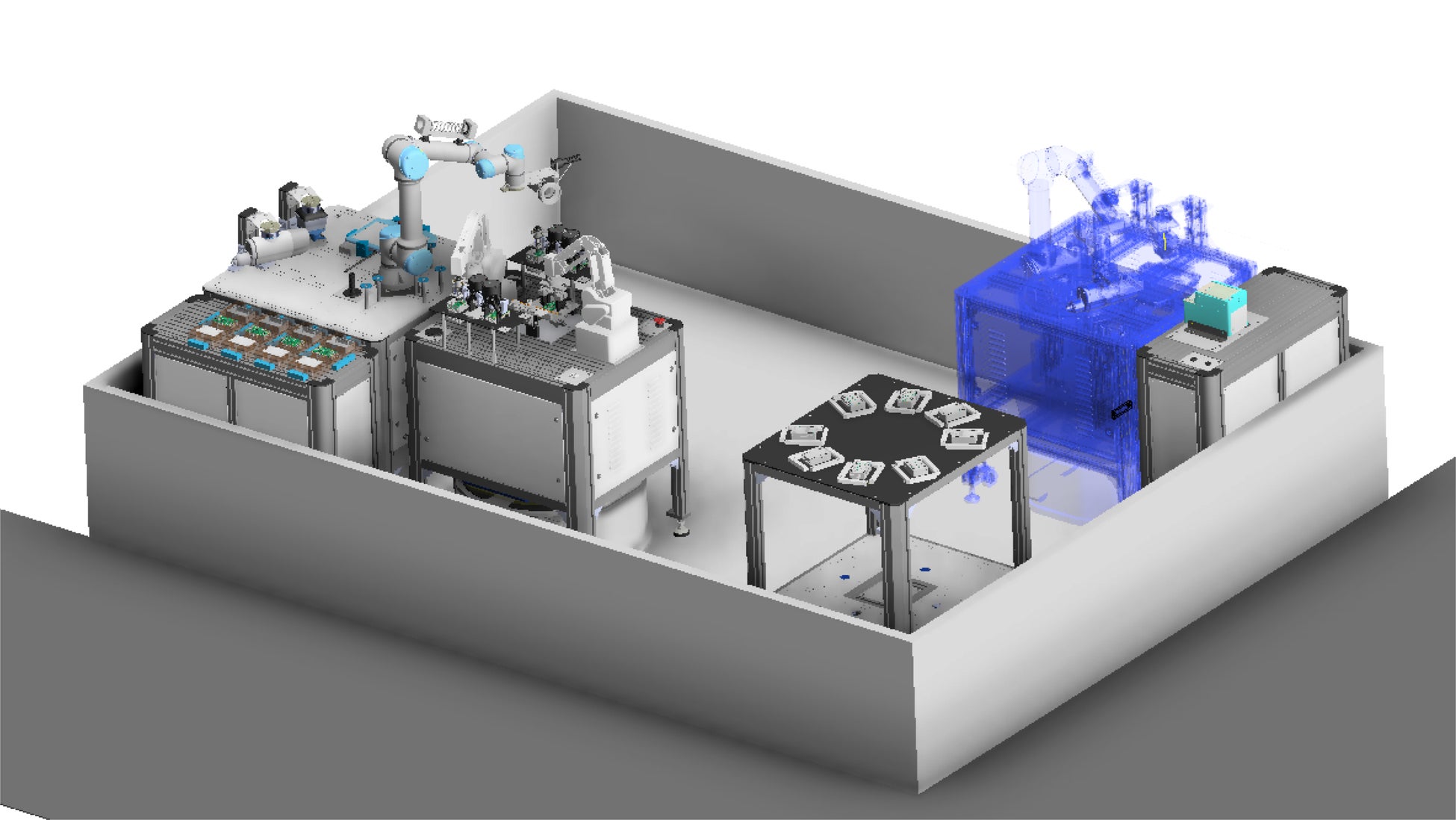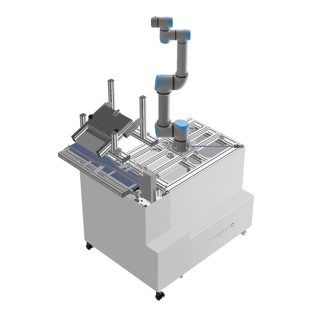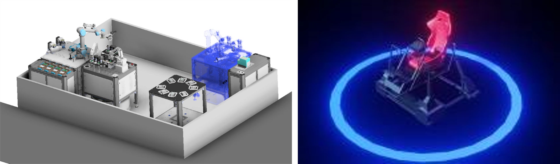生産現場において手作業で実施すると時間がかかる工程や正確さが求められる工程において、自動化の優位性を対戦形式のデモで体験できる技術PRコンセプト機。協働ロボットとカメラ、コンベア、パーツフィーダなどの周辺機器を連携させ、以下の生産工程の自動化を実現。