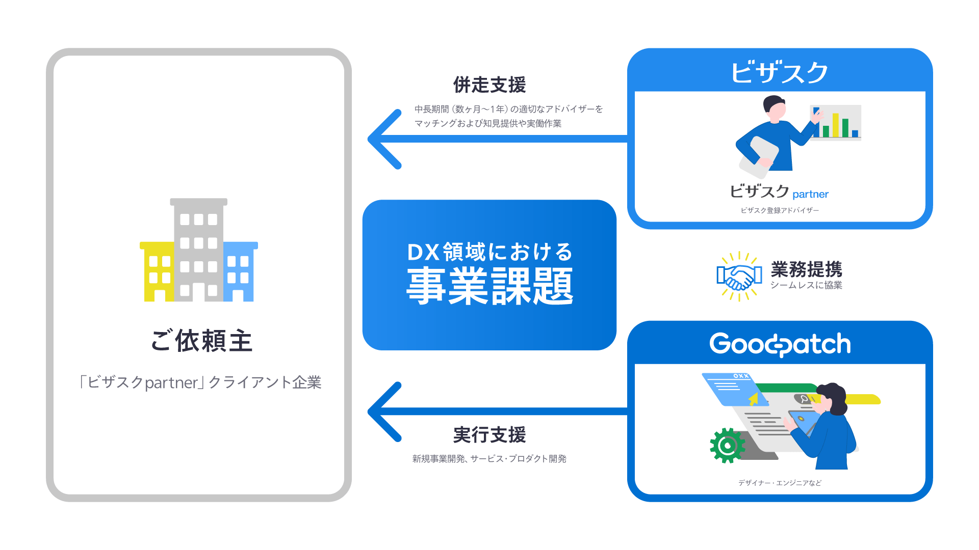 このような背景から、「ビザスクpartner」の戦略パートナーとしてグッドパッチが携わることで、グッドパッチに所属する600名以上のデザイン・開発人材の中から顧客課題に最適化されたメンバーによる支援体制を提供が提供できるようになります。経営課題からプロダクト開発までの、シームレスなソリューションの提供につながり、「ビザスクpartner」クライアント企業の価値向上に貢献できると考えています。
