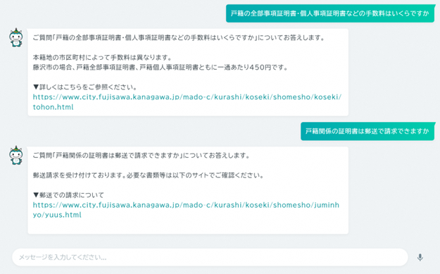 (例)戸籍の請求などの諸手続きについて「ふじキュン♡」が回答してくれます。