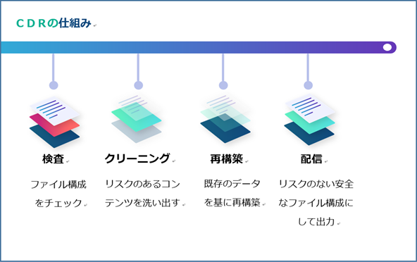 「Glasswall」は、メールなどを介して受領したすべてのファイルを瞬時に無力化し再構築するCDR(Content Disarm and Reconstruction)プラットフォーム製品です。もしファイル内に悪意のあるマルウェアウイルスが潜在していても、自動で安全なファイルとして手元に届くシステムのため、社員のネットリテラシーによる判断に依存することなく安全にファイル開封ができます。攻撃コードの「検知」に依存しないため、未知の(ゼロデイ)攻撃でも有効なソリューションとして、組織全体のセキュリティ対策向上に貢献します。
