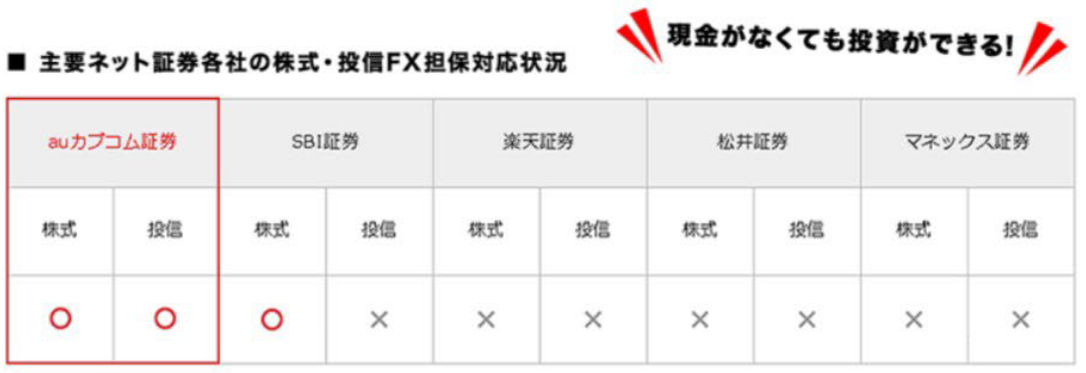auカブコム証券なら「株式」だけでなく主要ネット証券で唯一、「投資信託」もFXの証拠金として担保にできますので、より効率的で有効な投資の実現が可能です。