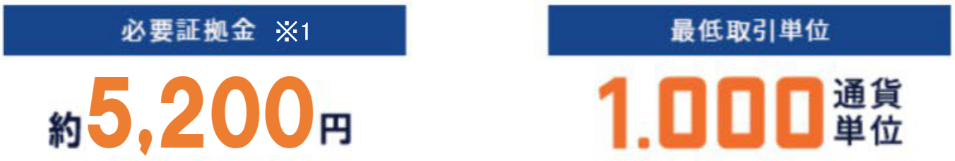 1,000通貨からお取引いただけるため、少ない投資金額で取引が可能です。レバレッジ25倍、米ドル/円130円なら、約5,200円の証拠金から取引可能です。