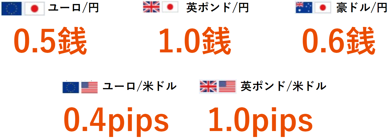 ※上記スプレッドは固定されたものではありません。市場の急変時(震災などの天変地異、各国中央銀行の市場介入、その他外部要因)や、市場の流動性が低下している状況(米国東部時間午後5時前後、 年末年始、クリスマス時期など)、経済指標の発表前後などにより、スプレッドが拡大する可能性があります。