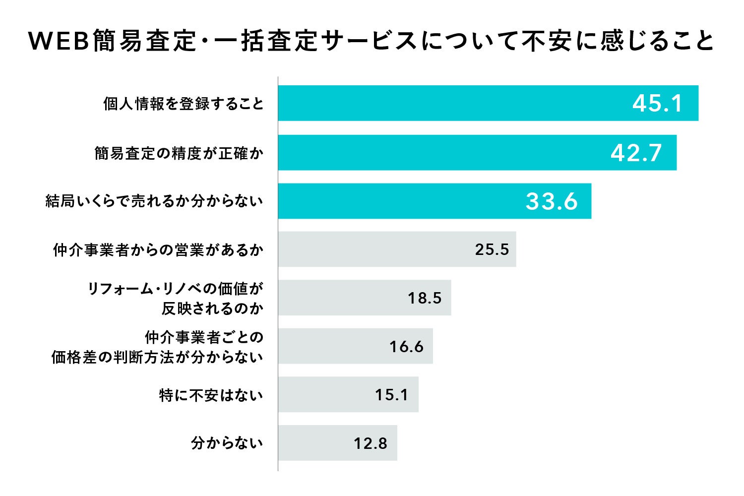 ③上記②の設問から、WEB上で受けられる簡易査定は、自宅の価格が気になった人の4割程度が実施する手法であることが分かりました。WEB上で受けられる簡易査定や一括査定サービスに対して感じる不安を聞いたところ、「個人情報を登録すること」(45.1%)、「簡易査定の精度が正確か」(42.7%)、「結局いくらで売れるか分からない」(33.6%)という結果となりました。