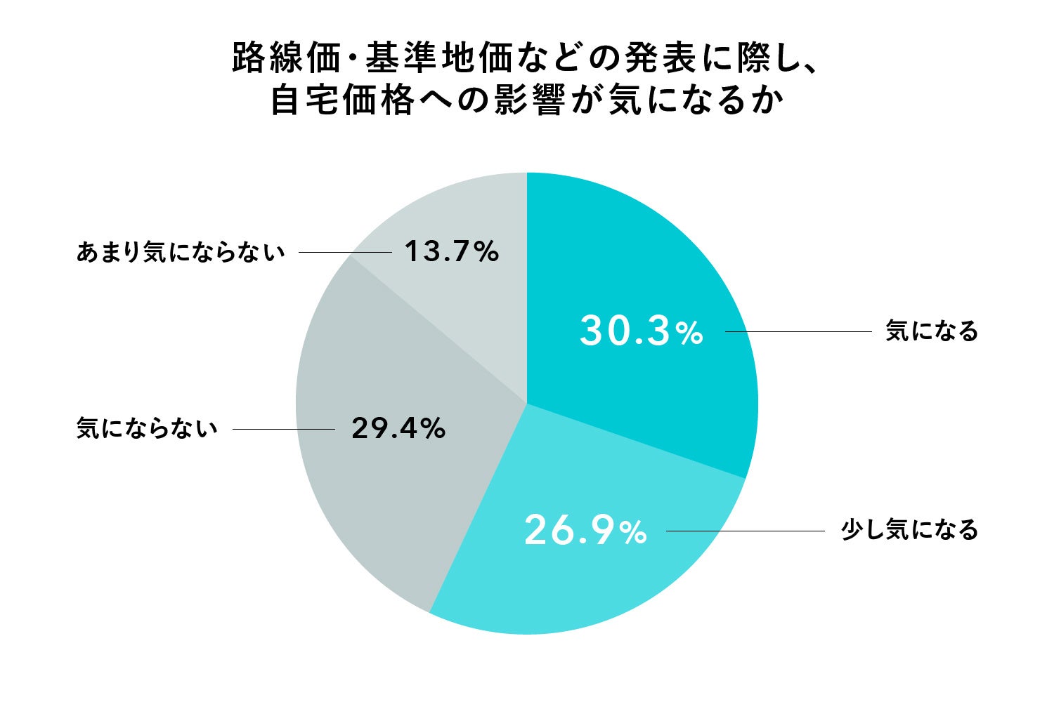 ①毎年7/1に路線価の発表、9月下旬に基準地価が発表されます。このような公的機関からの土地の価格に関する発表がある際に、自宅の価格が気になる人が半数を超える(56.9%)ことが分かりました。土地の価格に関する発表やニュースに触れることで、保有する不動産(自宅)の価格への意識が高まることが分かります。