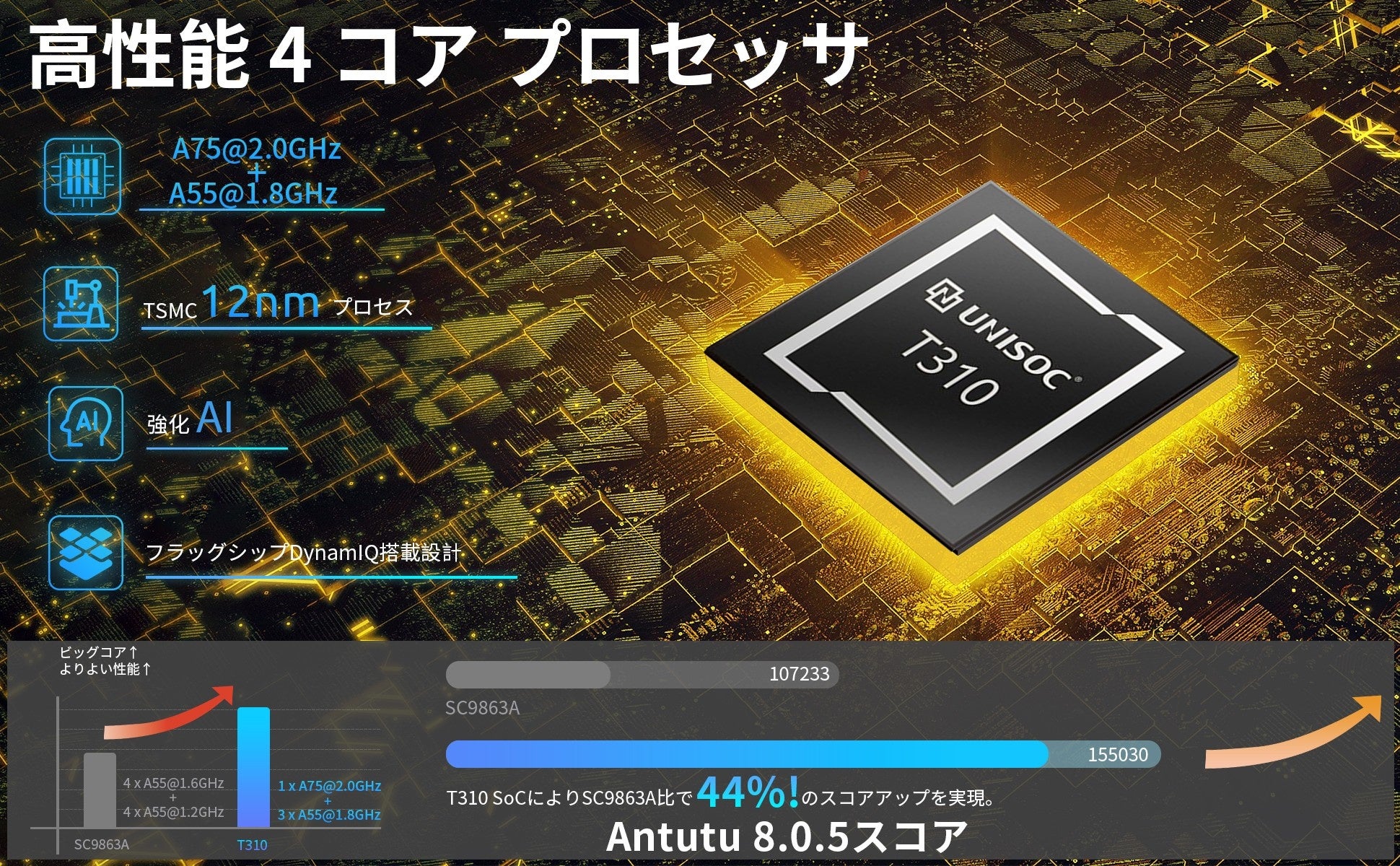 4コア UNISOC T310 (1*A75 2.0Ghz+3*A55 1.8Ghz)