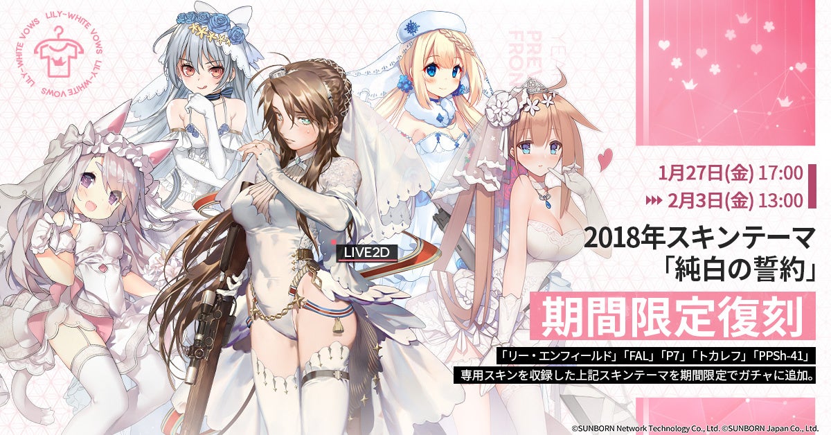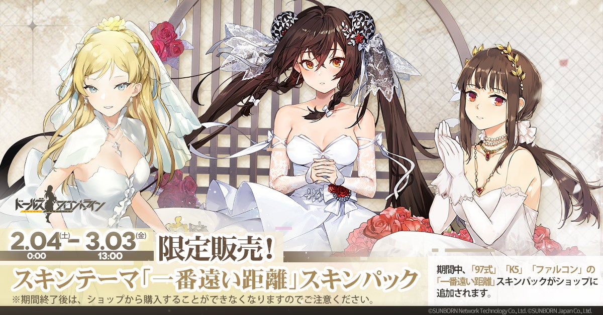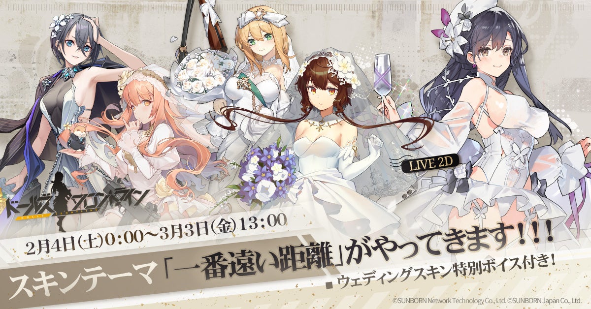 株式会社サンボーンジャパンは、スマホ向け戦略型シミュレーションゲーム『ドールズフロントライン(以下、「ドルフロ」)』において、2月4日(土)0時より追加される雪のような純白のウェディングドレスの新スキン『一番遠い距離』を先行して公開いたします。
