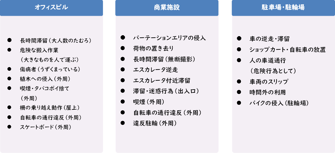- 検知する対象が人やモノではなく画素の集合で検知するため、火災、侵入、逆走、転倒、集団など、様々な場面に対応可能