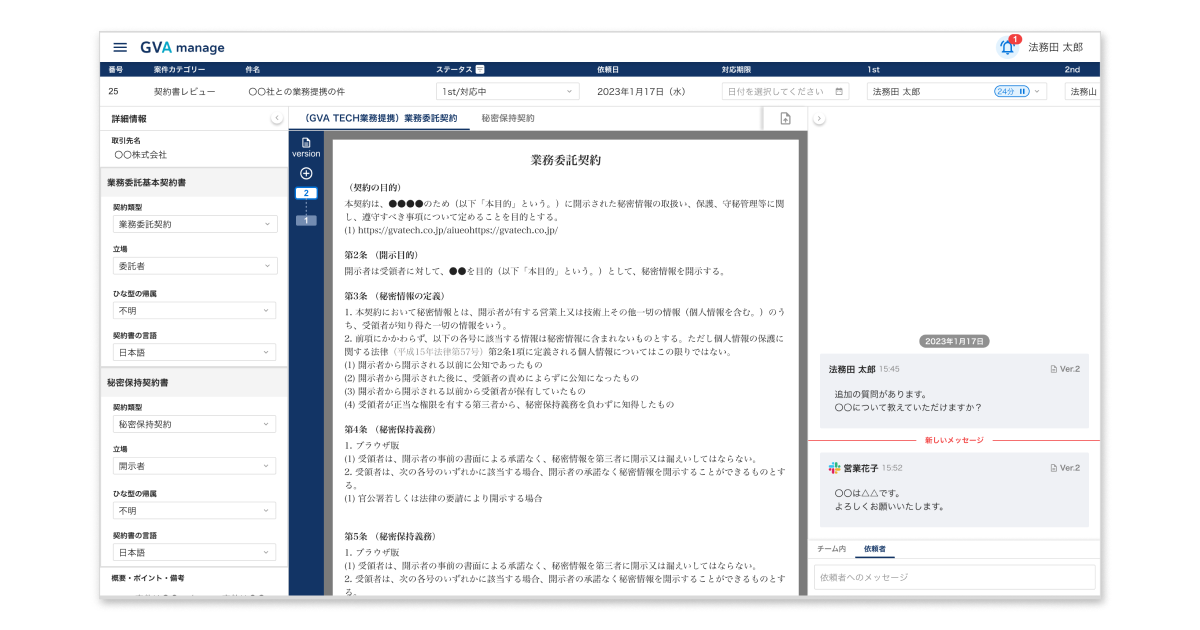 GVA manage(ジーヴァマネージ)は、契約書の作成・レビューや法律相談などの法務案件を一元管理するクラウドサービスです。法務案件を依頼する事業部担当は専用のアカウントが不要で、普段やりとりに使用しているメールやチャットツールに返答するだけで、法務と事業部間の質疑などメッセージや契約書などの添付ファイルを、GVA manageに集約することができます。法務部は集約されたデータを検索することができ、過去案件の調査に掛ける時間を大幅に削減できます。
