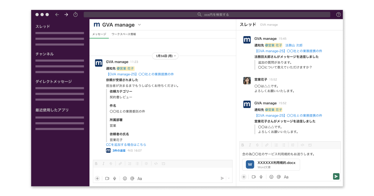 日常の社内コミュニケーションにSlackを活用している企業では、Slackだけでコミュニケーションが完結することが多く、法務案件(法律相談や契約書の作成・レビューなど)についても専用のチャンネルでコミュニケーションをして完結しています。