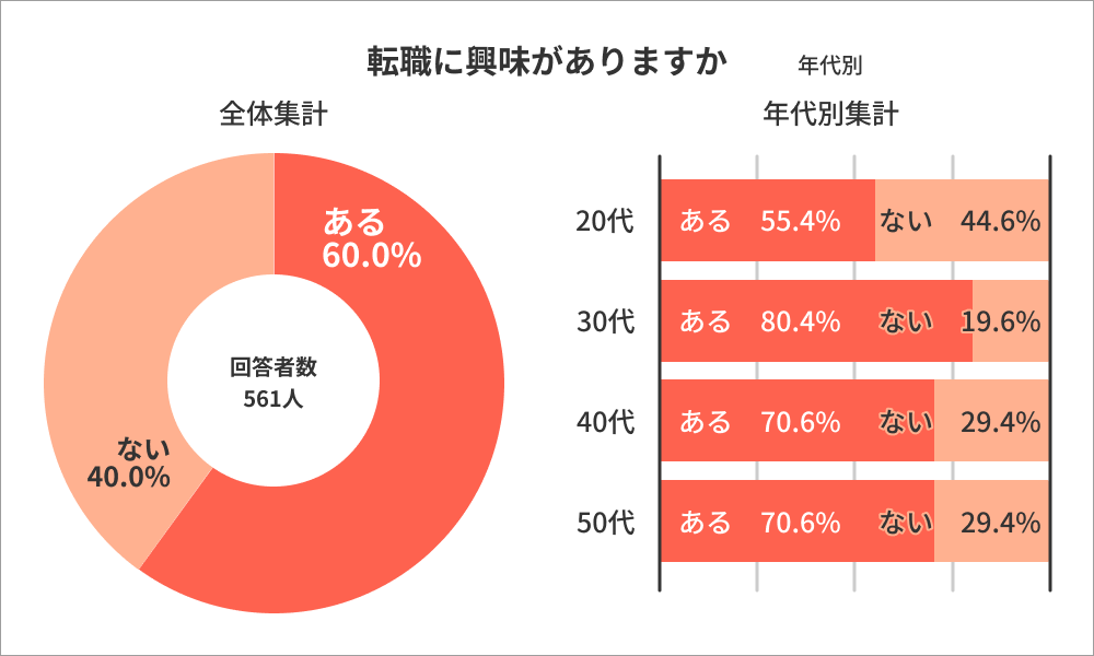 今後の転職に興味を持っているかについては、全体の60.0%が「ある」と回答し、「ない」は40.0%でした。これを年代別で見ると「ある」と回答した20代は55.4%で、30代は80.4%、40代は70.6%、50代も同じく70.6%の回答になり、30代以上は全年代で7割以上が今後の転職に興味があるのに対して、20代は55.4%と、年代で大きな差がある結果になりました。