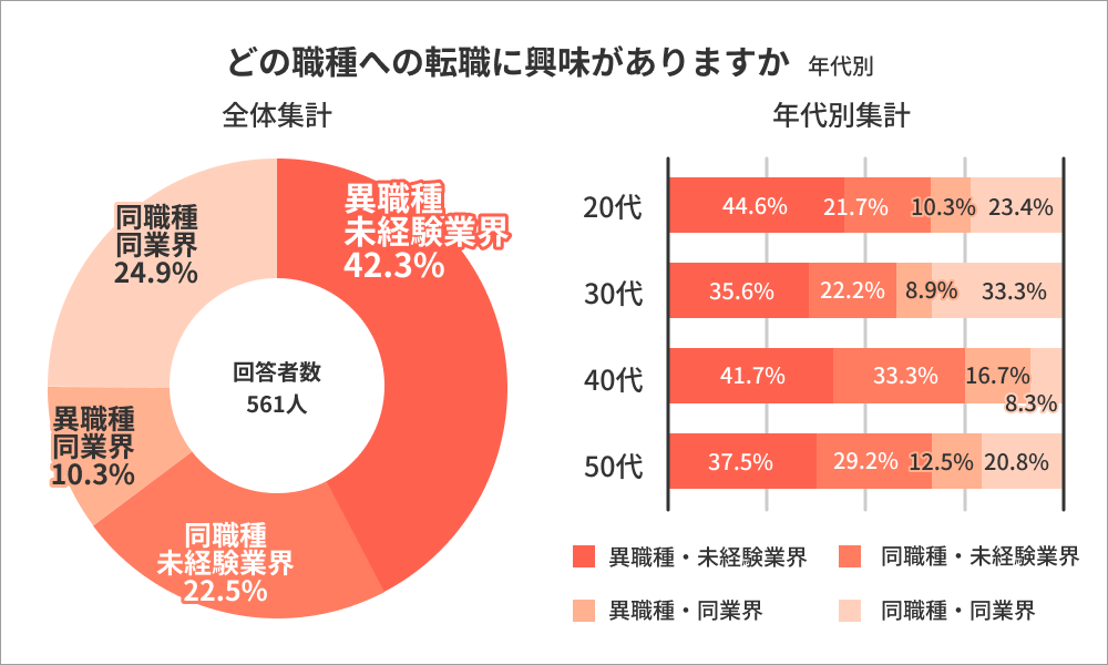 転職で興味を持っている職種と業界について聞くと、全体の42.3%が「異職種・未経験業界」で最多回答になり、次いで「同職種・同業界」が24.9%、「同職種・未経験業界」が22.5%、「異職種・同業界」が10.3%の回答結果になりました。またこれを年代別で見ると全年代で「異職種・未経験業界」が最多回答で、「異職種・同業界」が最も少ない回答結果になりました。