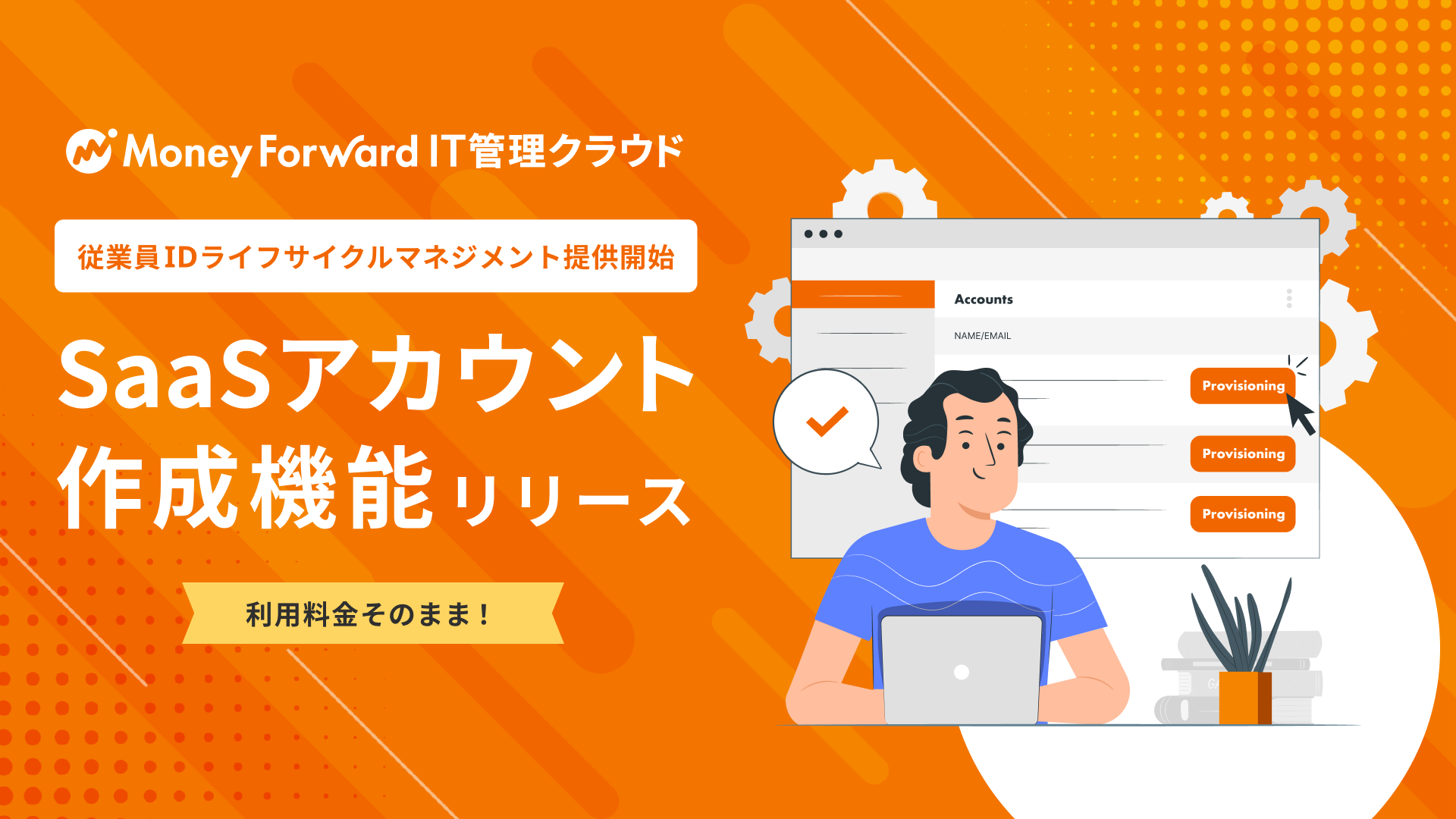 『マネーフォワード IT管理クラウド』上で、SaaSアカウントの作成※4ができるようになりました。これにより、入社時のアカウント作成、就業中のコスト管理、シャドーITの検知、そして退職時のアカウント削除まで、従業員のフェーズに応じて発生する様々なSaaS管理業務が、料金は変わらずに『マネーフォワード IT 管理クラウド』上で網羅できます。
