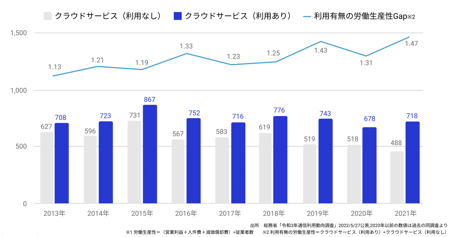 SaaSの社内利用の増加は企業に利便性をもたらしています。「SaaS業界レポート2022」には「クラウドサービスを利用している企業は利用していない企業に比べ、労働生産性が150%近く上回っている」、というデータも示されています※1。
