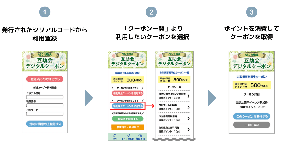 職員に配布したシリアルコードと、職員番号の2つで認証を行います。認証が完了すると、利用可能なポイントが配布されます。利用できるクーポン一覧から希望のクーポンを選択し、ポイントと引き換えに取得することができます。