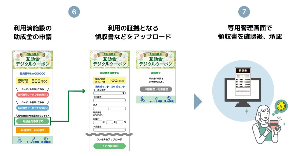 職員はクーポンの獲得・利用・申請を全てスマホで完結でき、本部は利用状況の把握と承認を管理画面からスムーズに行うことができます。
