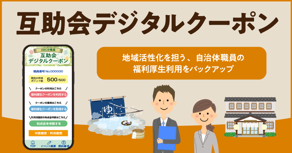 「自治体向けデジタルクーポン」は、観光・来店促進など、行政による地域活性化施策をサポートするモバイルクーポンサービスです。ラインナップに今回新たに追加された「互助会デジタルクーポン」は、県職員や市職員などの各種職員だけが利用できる認証式電子クーポンとなっています。枚数を減算するタイプや、利用済のクーポンに後日助成金を申請するキャッシュバックタイプなど、互助会運営をサポートする様々なクーポンの提供が可能です。