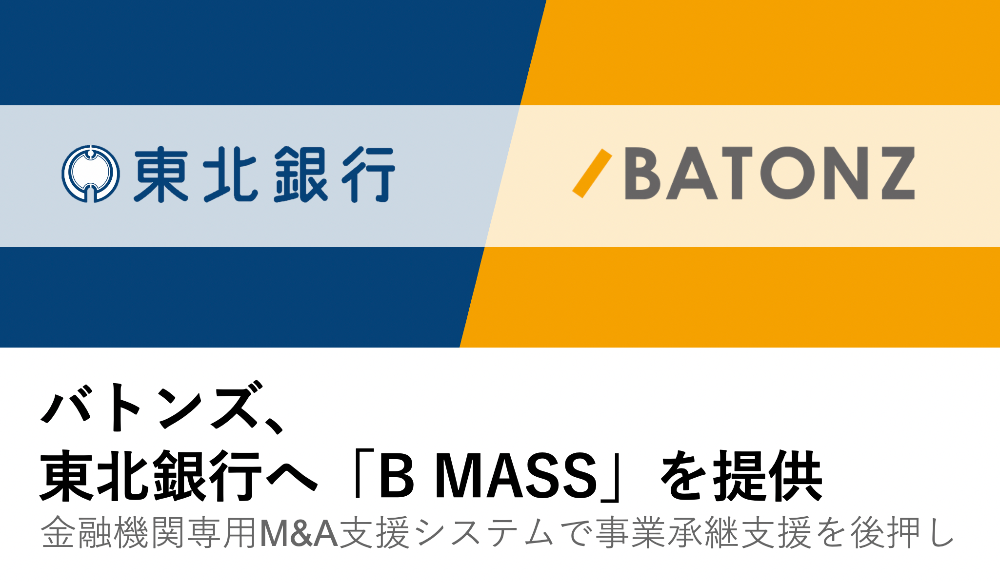 後継者のいない中小企業・小規模事業者の第三者承継・M&Aを推進するため、バトンズは東北銀行へ「B MASS」を提供し、事業承継支援を後押しします。