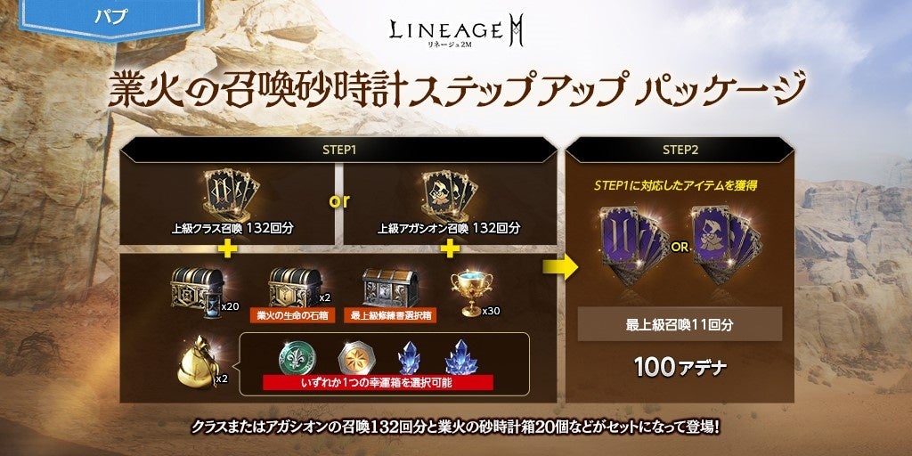 「業火の砂時計箱(刻印)」20個に、クラスまたはアガシオン召喚132回分、「業火の最上級修練書選択箱(刻印)」1個、「業火の生命の石箱(刻印)」2個などがセットになった「業火の召喚砂時計ステップアップ パッケージ」が登場しました。