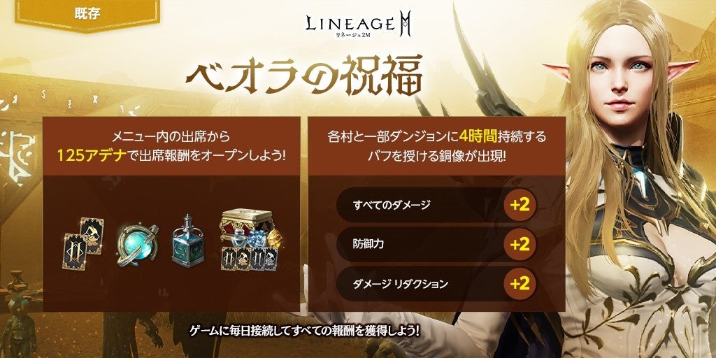期間中、125アデナでオープンすることができる出席報酬「ベオラの宮殿」が登場します。デイリー報酬として「アインハザードの祝福」2,000が獲得できるほか、「上級クラス/アガシオン獲得券(6回)(イベント)」や「古代エルフ王国女王の下賜品(イベント)」などのアイテムを獲得することができます。