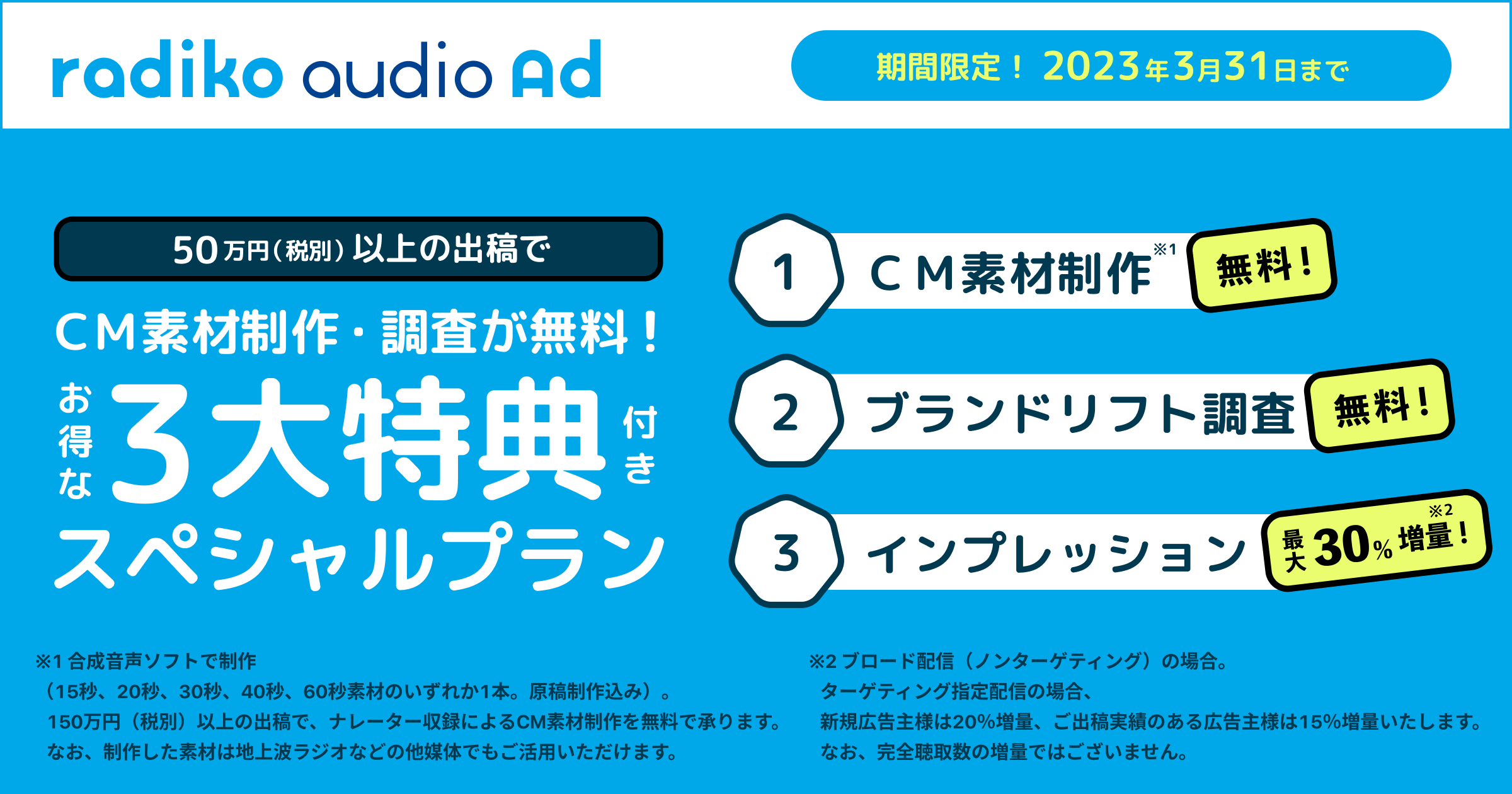 2023年3月31日までの期間限定で、通常よりもお得にラジコオーディオアドに出稿いただけるスペシャルパッケージプランもご用意。50万円(税別)以上の出稿でCM素材制作とブランドリフト調査が無料になり、広告配信のインプレッションも最大30%増量いたします。