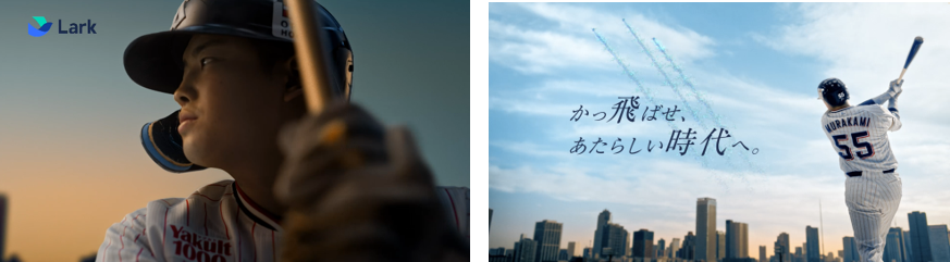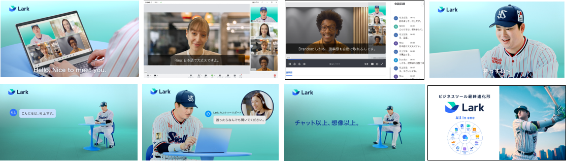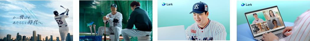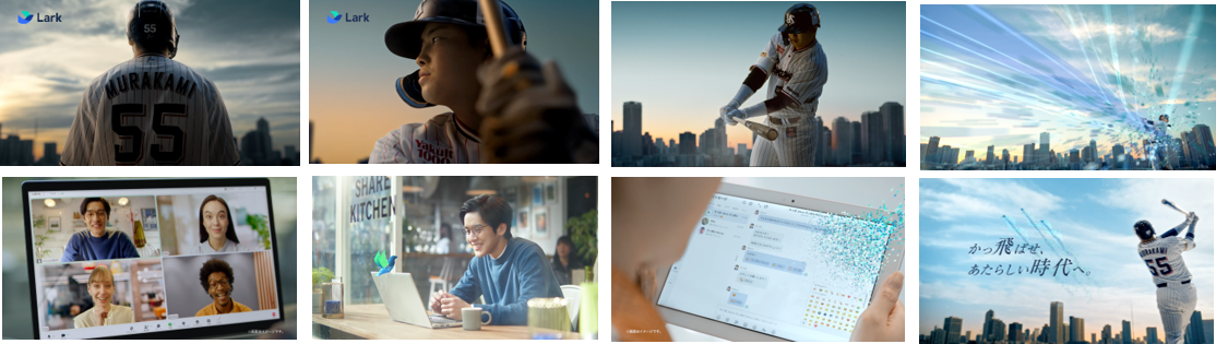 WEB CM /Taxi CMでは、ビジネスツール「Lark」を村上選手が実際に体験。 「チャット篇」「ビデオ会議篇」「オールインワン篇」の3パターンの映像を公開しています。村上選手は初めてLarkを操作しましたが、オペレーターの頼れる対応で安堵。自動翻訳による字幕によるビデオ会話に驚嘆。Larkのシームレスでオールインワンな機能性に、村上選手も思わず「神っすね」とコメント。