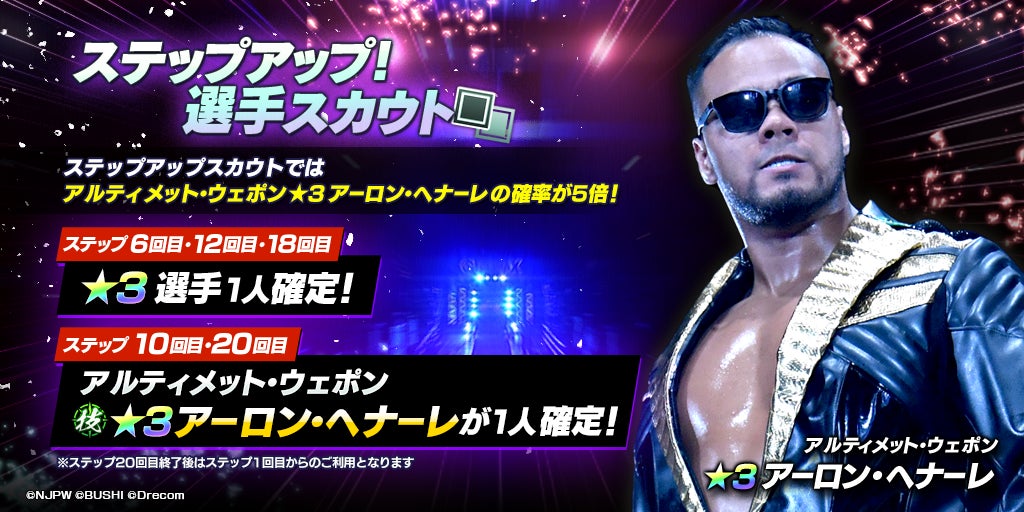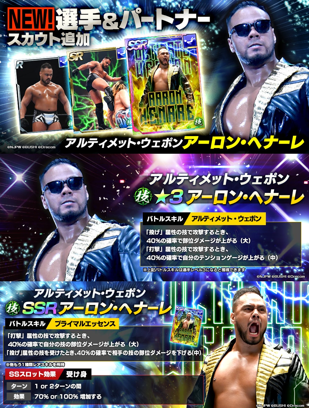 新日SSは2023年1月25日(水)メンテナンス終了後から、新規育成選手として、★3選手「[アルティメット・ウェポン]アーロン・ヘナーレ」が登場する「ステップアップ!選手スカウト」を開催しています。