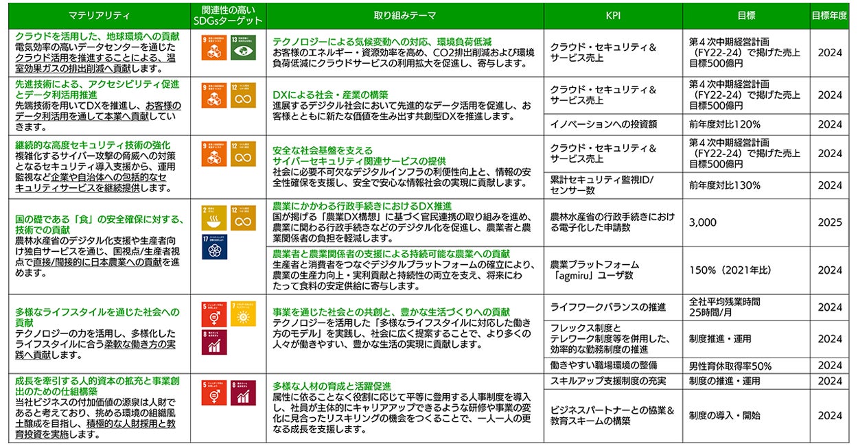SBTは、2022年4月、持続的な成長と事業を通じた持続可能な社会の実現への貢献に向けて、6つのマテリアリティを特定しました。このマテリアリティは、SBTの経営理念および事業における長期目標を達成するための縦横な活動指針となるもので、「クラウドを活用した地球環境への貢献」、「先進技術による、アクセシビリティ促進とデータ利活用推進」、「継続的な高度セキュリティ技術の強化」、「国の礎である『食』の安全確保に対する、技術での貢献」、「多様なライフスタイルを通じた社会への貢献」、「成長を牽引する人的資本の拡充と事業創出のための仕組構築」の6つのマテリアリティを特定しています。