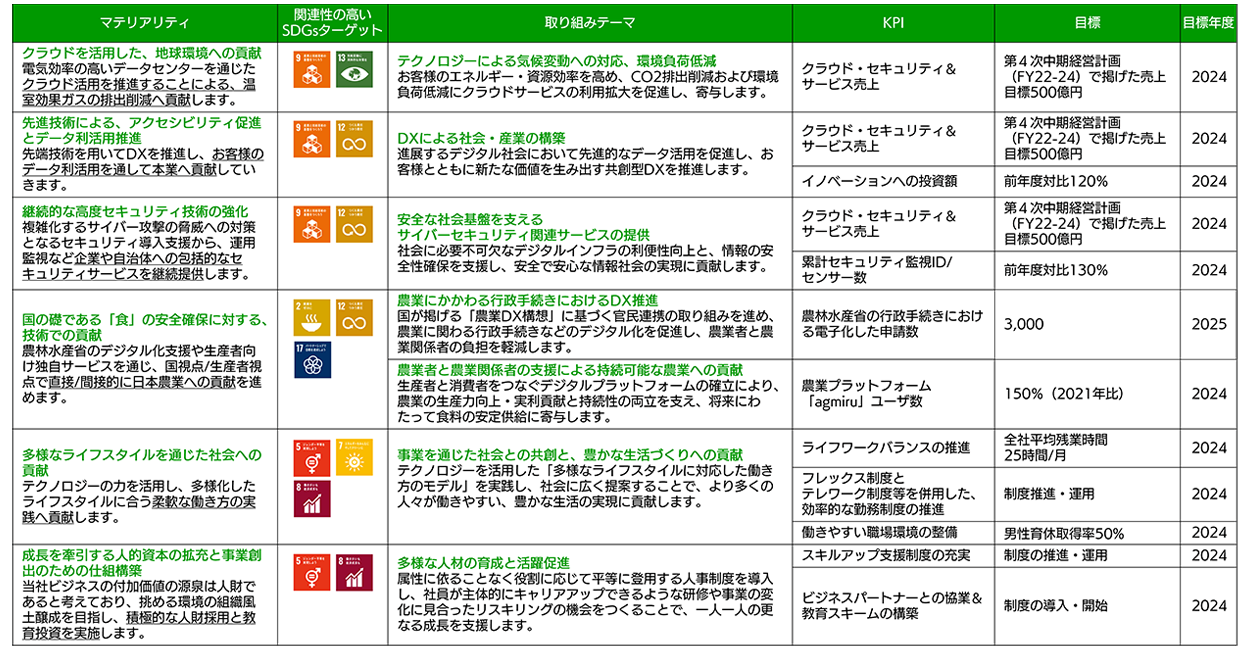SBTは、2022年4月、持続的な成長と事業を通じた持続可能な社会の実現への貢献に向けて、6つのマテリアリティを特定しました。このマテリアリティは、SBTの経営理念および事業における長期目標を達成するための縦横な活動指針となるもので、「クラウドを活用した地球環境への貢献」、「先進技術による、アクセシビリティ促進とデータ利活用推進」、「継続的な高度セキュリティ技術の強化」、「国の礎である『食』の安全確保に対する、技術での貢献」、「多様なライフスタイルを通じた社会への貢献」、「成長を牽引する人的資本の拡充と事業創出のための仕組構築」の6つのマテリアリティを特定しています。