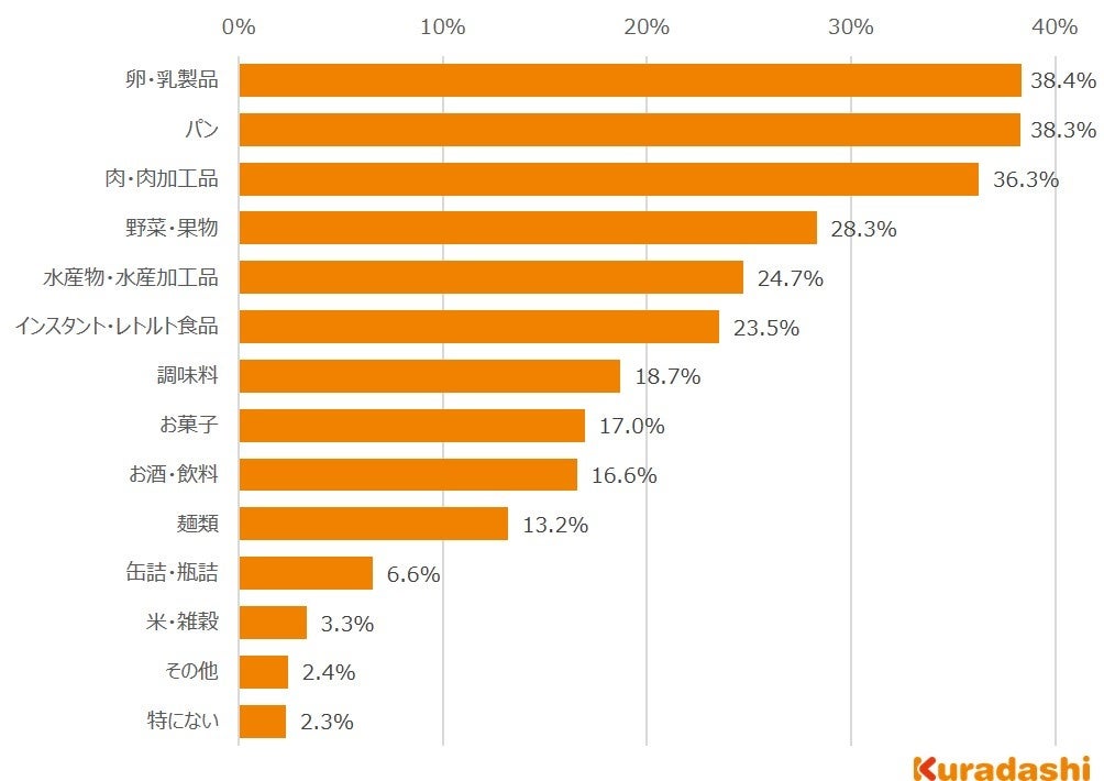 特に値上げされていると感じる食品は「卵・乳製品」が最も多く38.4%、次いで多かった回答は「パン」で38.3%、「肉・肉加工品」で36.3%でした。