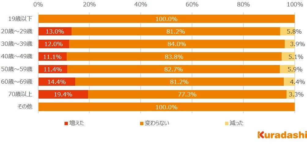 70歳以上で「増えた」と回答した方が19.4%で、他の世代と比較するとやや多い傾向にありますが、世代による大きな違いは見られませんでした。