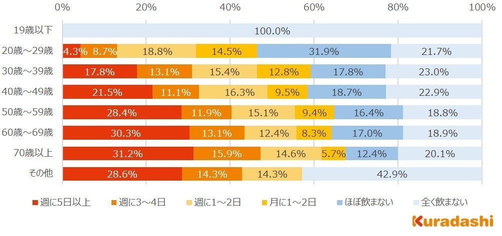 19歳以下とその他を除くと、「週に5日以上」と回答した方の割合は、70歳以上が最も多く31.2%、そこから年代が下がるにつれて割合は減少し、20歳~29歳が最も少なく4.3%でした。年代が上がるほど、普段自宅でお酒を飲む人が多い傾向にあります。また、20歳~29歳「ほぼ飲まない」と回答した方が31.9%と、他の年代と10%以上の差があることから、若者のお酒離れが進んでいると推察されされます。