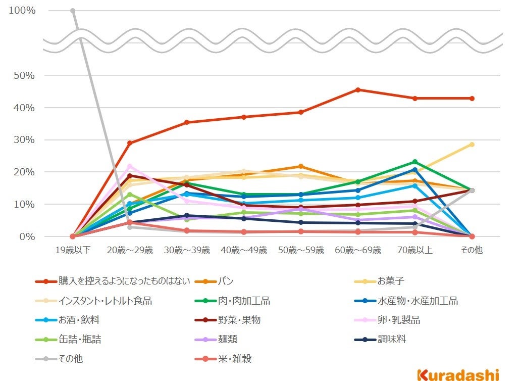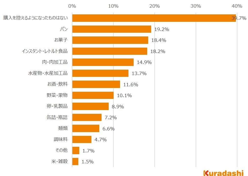 - 値上げが理由で購入を控えるようになった食品は「パン」が最も多く19.2%