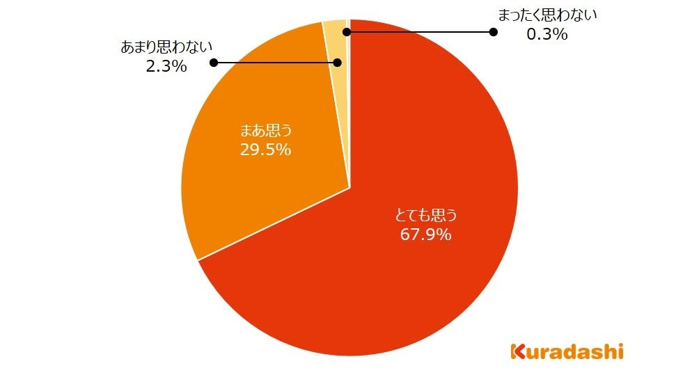 「とても思う」と回答した方が67.9%、「まあ思う」と回答した方が29.5%で、回答者全体の97.4%がよりお得に食品を購入したいと考えています。調査結果1を踏まえると、値上げによる家計への影響はあまり感じていないもののよりお得に食品を購入したいと考えている方が、回答者全体の10%程度いることが読み取れます。
