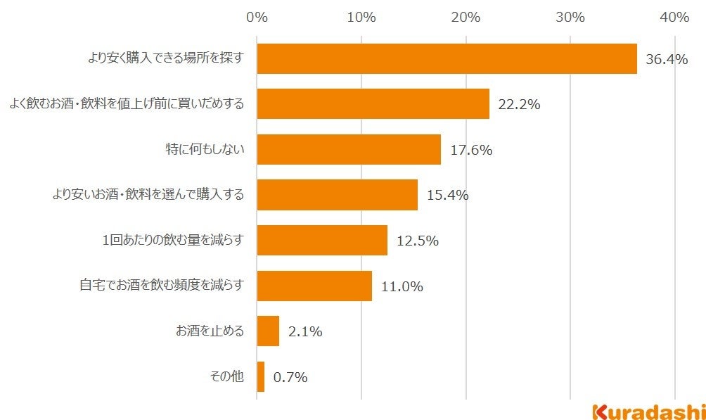 最も多かったものは「より安く購入できる場所を探す」で36.4%、次いで「よく飲むお酒・飲料を値上げ前に買いだめする」で22.2%でした。一方で「1回あたりの飲む量を減らす」が12.5%、「自宅でお酒を飲む頻度を減らす」が11.0%だったことから、飲む量や頻度を減らすことなく、工夫してお酒を楽しもうという方が多いことが読み取れます。