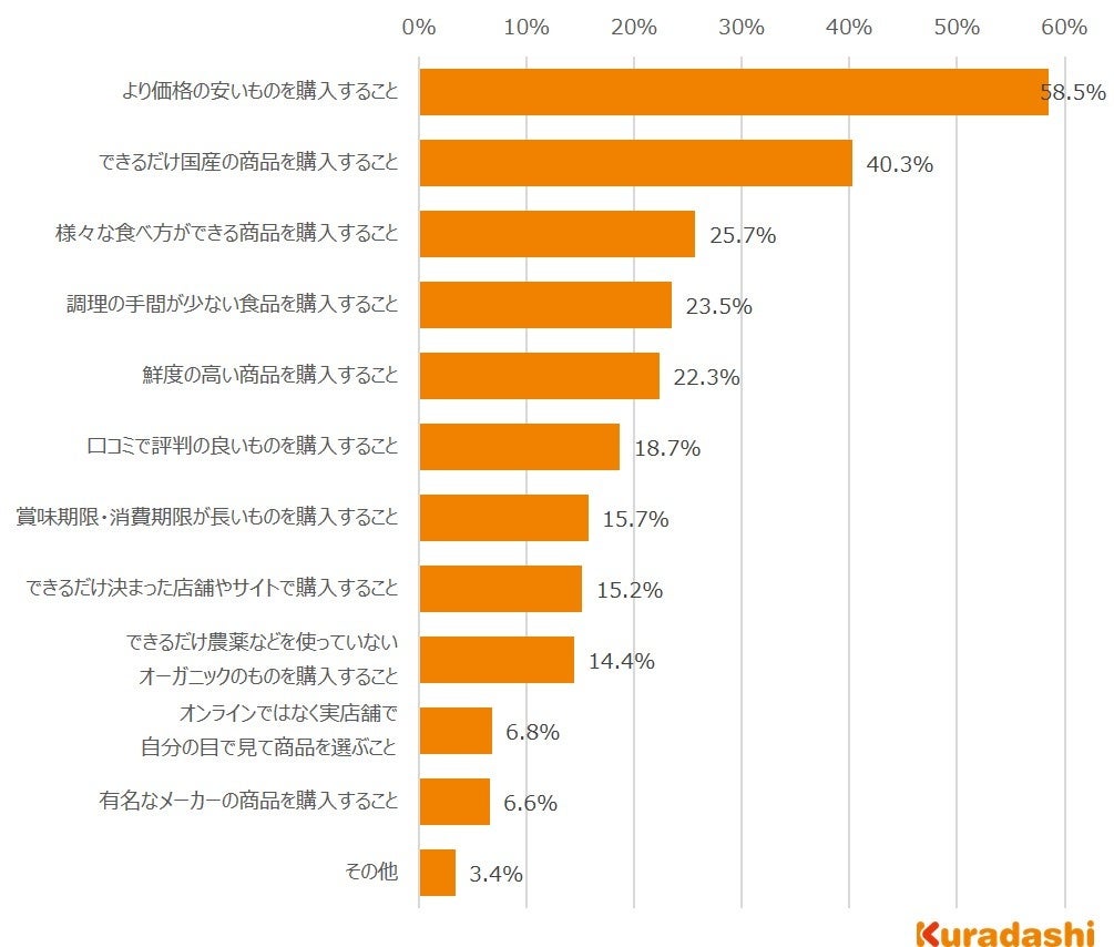 最も多かった回答は「より価格の安いものを購入すること」で58.5%、次いで「できるだけ国産の商品を購入すること」で40.3%でした。その他を除いて最も少なかった回答は「有名なメーカーの商品を購入すること」で6.6%、次いで「オンラインではなく実店舗で自分の目で見て商品を選ぶこと」で6.8%でした。