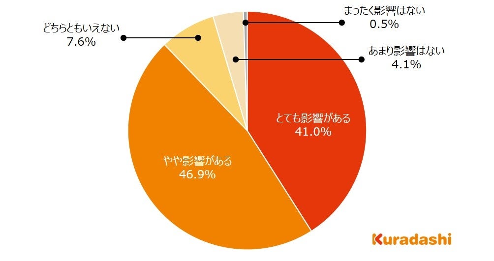 「とても影響がある」と回答した方が41.0%、「やや影響がある」と回答した方が46.9%で、回答者全体の87.9%が家計への影響を感じているという結果でした。