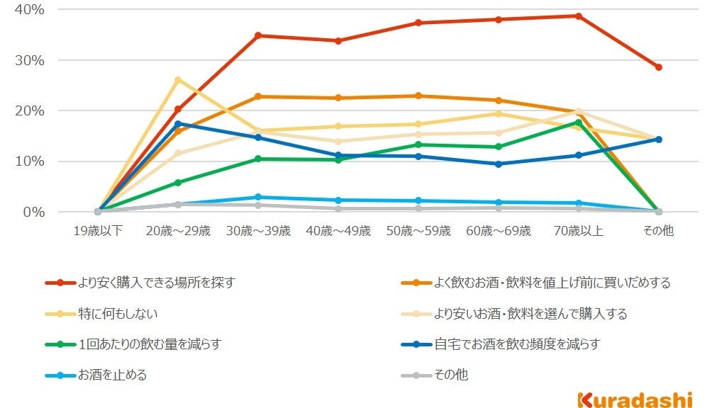 20歳~29歳では「特に何もしない」という回答が26.1%と最も多い一方で、他の年代では「より安く購入できる場所を探す」が最も多い回答でした。