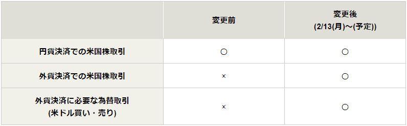 - これまで米国株の注文時の取引通貨は円のみしか選択できませんでしたが、米国株「外貨決済サービス」の開始に伴い、取引通貨を米ドル、円から選択することが可能となります。