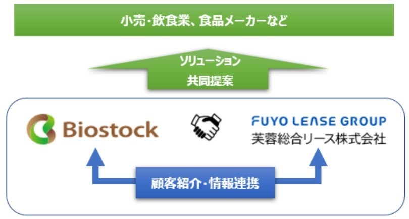 ビオストックは芙蓉リースから紹介を受けたお客様に対して、食品残渣の量や種類に応じた最適なソリューションの選定およびコスト削減効果を含めた試算などを行い、芙蓉リースの金融サービスを付加したソリューション提案を共同で行っていきます。