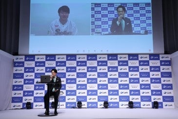 本発表会では、「Lark」のサービス説明と村上選手が出演した新CMをお披露目。サービス説明では、村上選手が「Lark」のビデオ会議機能を実体験。「画質もきれいですし、なにより翻訳機能が素晴らしいと思います。これで世界中の人と会話できますね」と驚きのコメント。