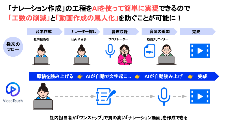 - 動画の作成自体はVideoTouchにより容易に実現できるが、ナレーションの品質は属人的な差がでてしまう。