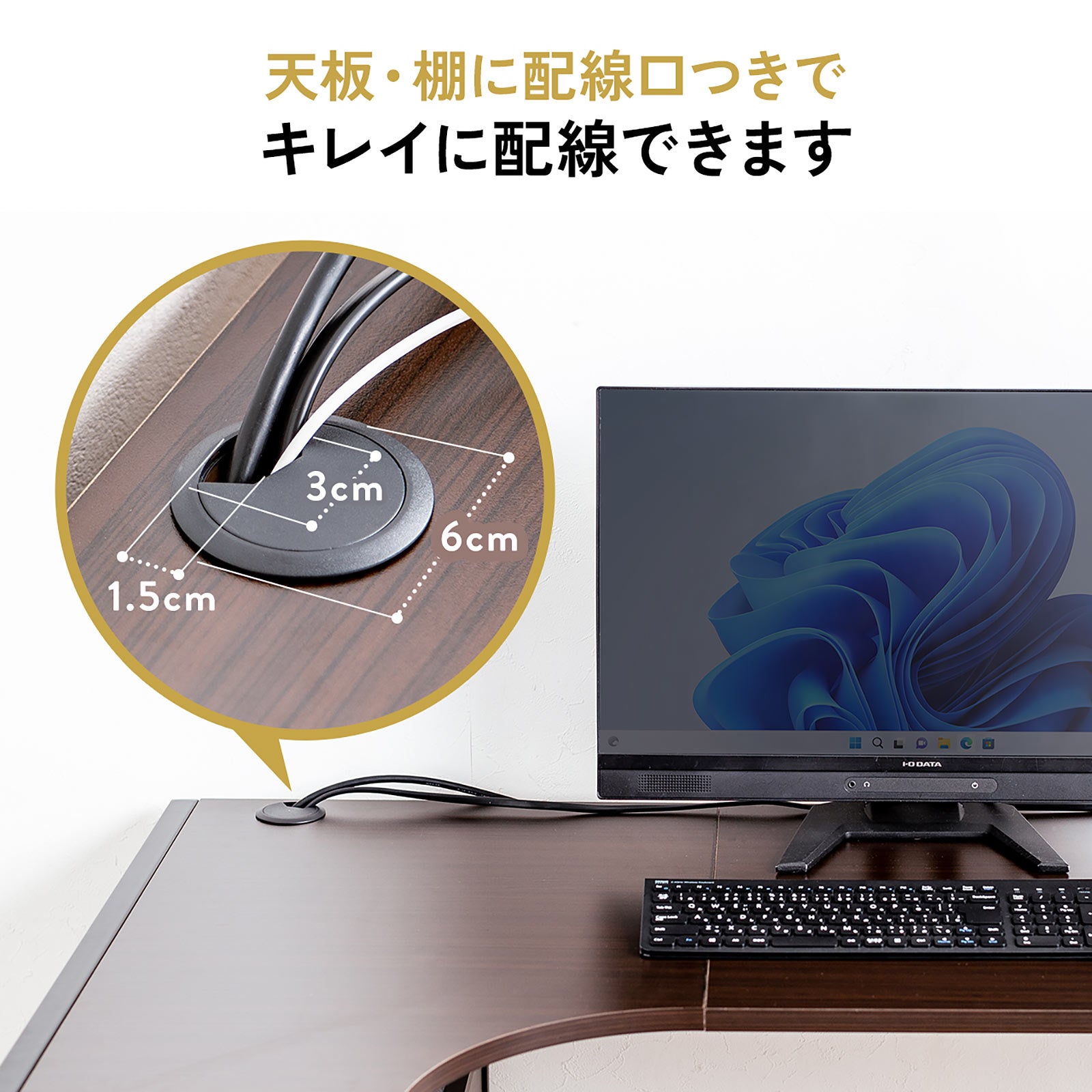 天板と収納棚には、配線口付きで、きれいにケーブル配線が可能です。