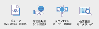 プログラムをインストールすることなく、ブラウザで簡単に文書を閲覧でき、スキャンしたドキュメントもOCRで読み取り、全文検索が可能となります。タグを指定すれば条件別に文書を分類することができます。日本語、英語、中国語、韓国語、ドイツ語、フランス語の6ヶ国語に対応し、マニュアルも各言語別に閲覧でき、多国間のプロジェクトでも円滑に使用することができます。